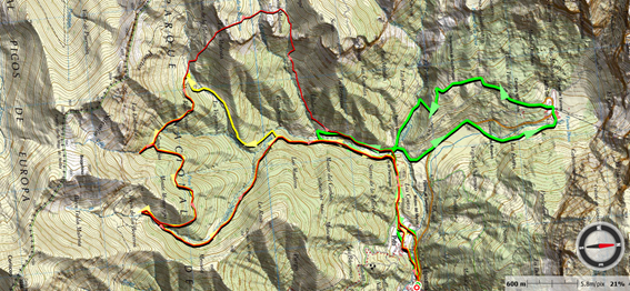 El plan del día consiste en atravesar el sector más denso y profundo de Salvorón a partir de Pido, que sirve de punto de arranque a varias pistas y caminos que se dirigen a las principales vegas de pasto y a los puertos de altura. Las rutas A y B están trazadas para comunicar la Vega de Arriba con la Vega de Salvorón, también conocida como Hoya de los Becerros. El grupo B llegará hasta la primera por una pista que asciende de forma directa y cómoda, mientras que el grupo A dará un rodeo subiendo hasta los puertos altos por el camino de Llavajos, serpenteando entre arroyos y subiendo campo a través por las brañas. Antes de llegar al Alto de la Begerina, aprovechará un collado a 1815 metros, la Horcadina del Tapé, para acometer un vertiginoso descenso a la Vega. A partir de la Vega de Arriba, los dos grupos seguirán el mismo itinerario, aunque cabe la posibilidad de añadir alguna variante en la bajada final.