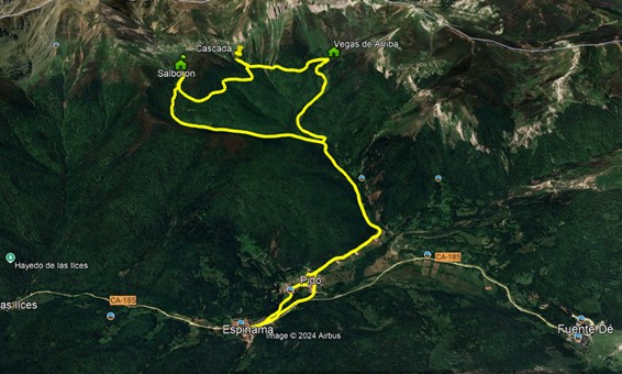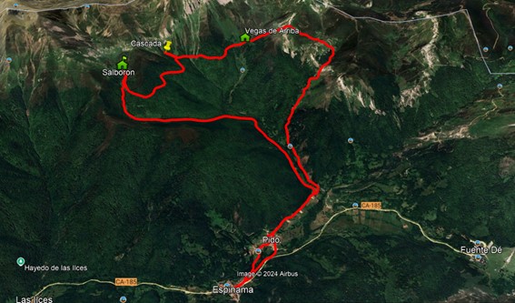 RECORRIDO: ESPINAMA 902 – Pido – Pontesqué – Llavajos – Horcadina del Tapé 1813 – VEGAS DE ARRIBA 1526 – Cuerre de Canalejas – Cascada de Canalejas (Los Embudos) 1584 – SalVorón 1637 – La Baduga – Los Parampiales – Cova Sendín – Las Bárcenas – Cueva de la Tía Petra – Pido – ESPINAMA 902.